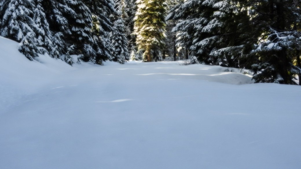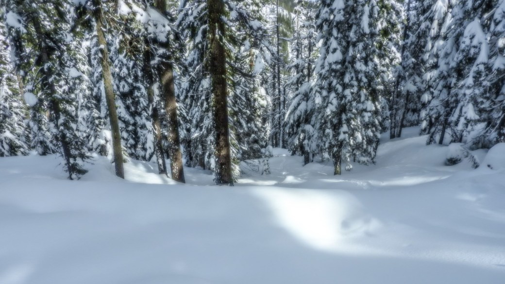 The wide road now became a narrow trail which soon became my own custom navigation through the trees. Keeping the sound of the creek on my right, I headed west over moguls created by saplings bent under the snow. I stepped around three foot ponderosa reaching 150′ into the sky. Sometimes I could tell I was above the trail because log cuts made vertical angles in the snow, but most of the time I was wandering freely among the firs and hemlocks.