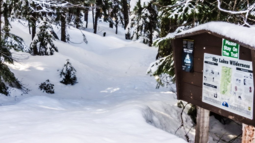 Leaving the road behind and its once-in-a-while vehicle noise, I entered a world of muffled silence. No birds. No animals. Tracks, but no creatures. All was quiet except for my snowshoes in the powder. A couple miles and an hour later I came to the Cherry Creek entrance to Sky Lakes Wilderness.