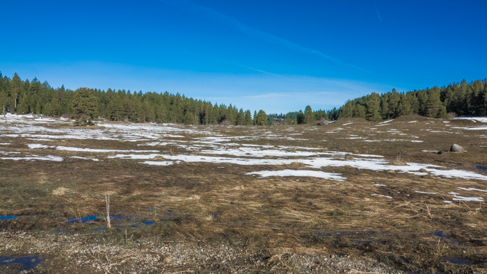 The good snow continued all the way to the overlook above Howard Prairie Lake. Then the snow almost disappeared as the bare patches became as big as the snow patches. I didn’t realize it in the summer, but now it was obvious that Howard is lower than Hyatt (by 500’) even though Howard is farther east and closer to the crest.