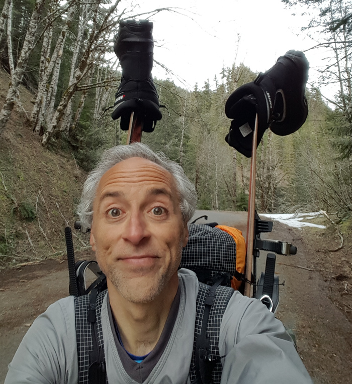 With skis more off than on, I contentedly made my way out of the valley, along the road, and into the flats at the junction of Lost Creek and Sandy River. I ate a late lunch while my stuff dried in the sun. My socks and boot inserts went from waterlogged (I had to step into a 3 inch stream crossing) to very damp.