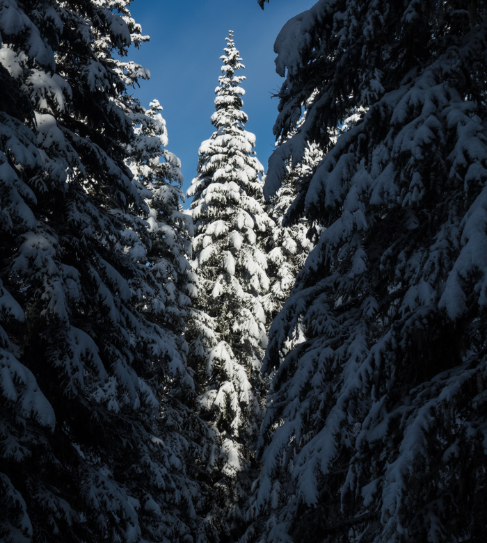 I shortcut the valley and stream a bit early, but thankfully there was a snow bridge. I collected water and ate breakfast in a little clearing among the thick, snow covered trees.