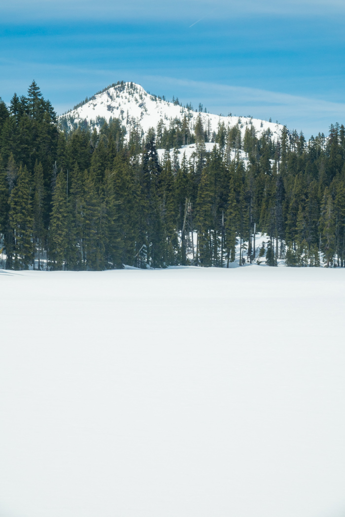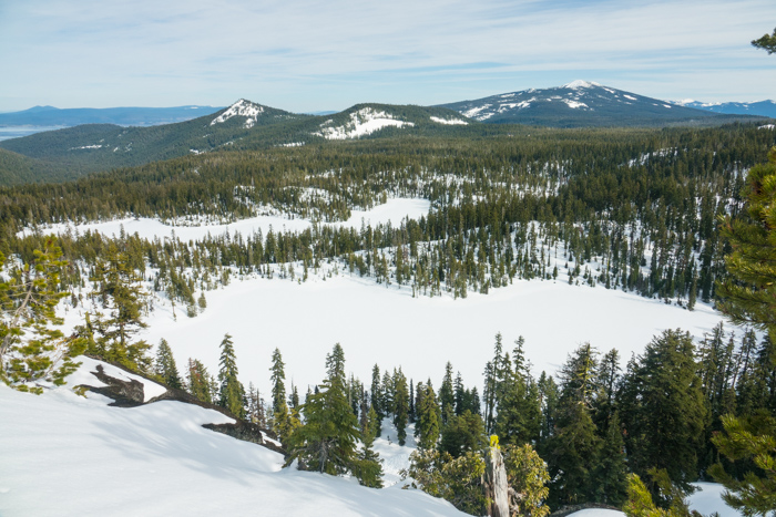 In the summer, I will hike the Sky Lakes trail north to Trapper Lake and Lake Margurette, then climb the huge boulders to the top of the bluff. There I have a “secret” tent spot that gives me a great view and sunrise. Because of the snow, I knew it would be foolish to attempt that climb, so I was headed in between trails to approach the bluff from the south on what appeared on my map to be a decent slope.