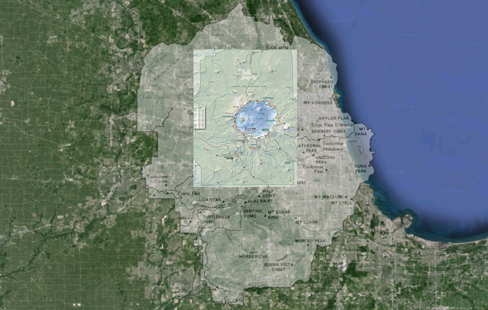 Here is Chicago with same-scale maps of Yosemite and Crater Lake superimposed
