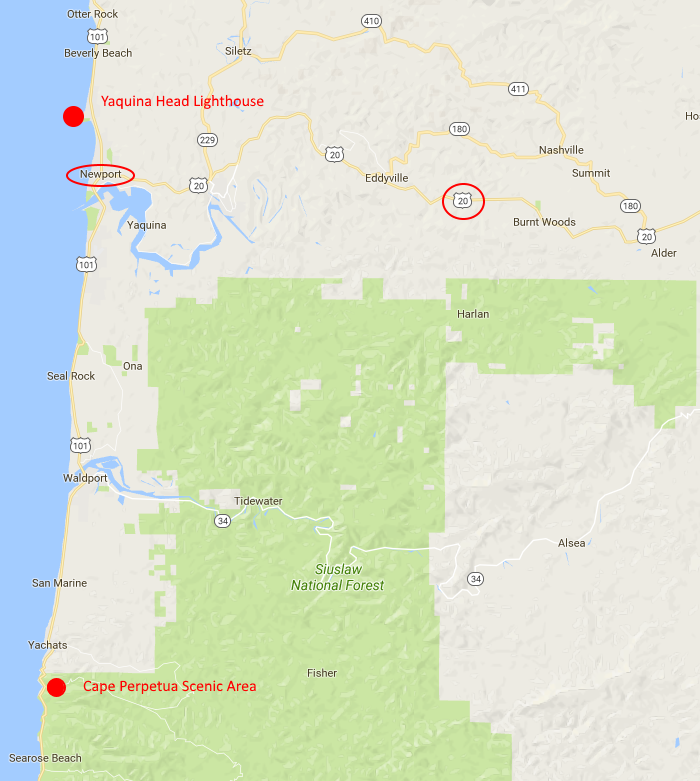 Take Hwy 20 through Corvallis to get to Newport, then go up and down the coast from there