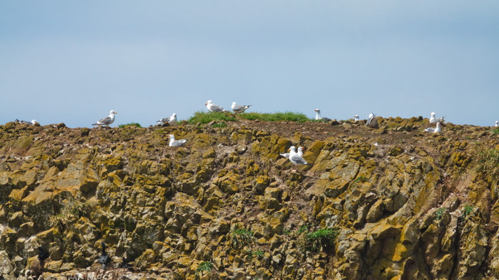 Gulls sunning on the rocks across from a beach south of Yaquina Head