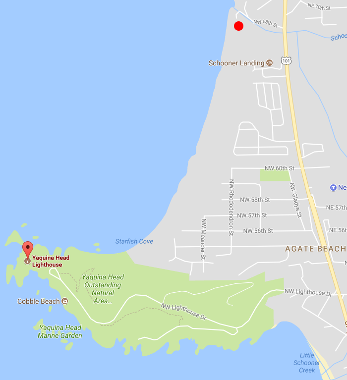 I found one! Notice the red dot at the top of the map below. The beach is at the end of 68th Street which is north of Agate Beach which is north of Newport. Because the broken pavement/gravel street is not obvious, it is probably easier to go well north, turn around, then slowly head south. Watch for a little street sign on the right. The parking lot at the end of the street is not well laid out, so you may want to back in to a spot. That way, if it fills up, you will not need to turn around with lots of cars around. Either way, enjoy the beach and the view!