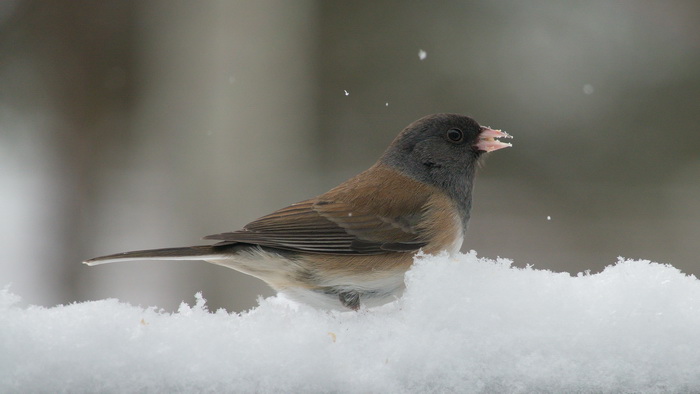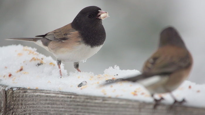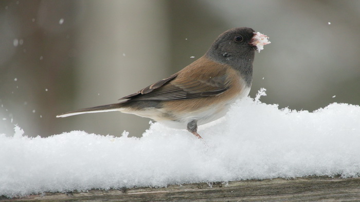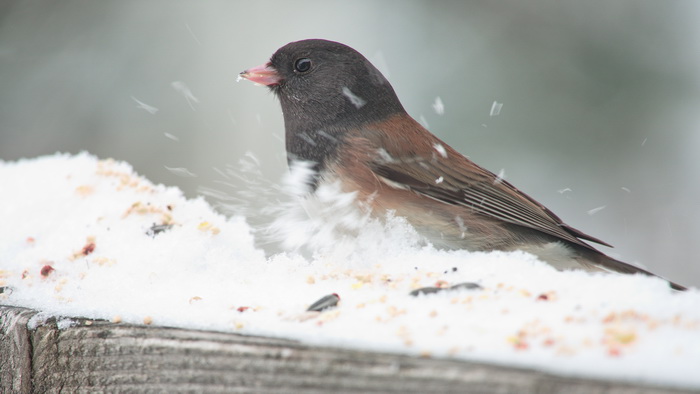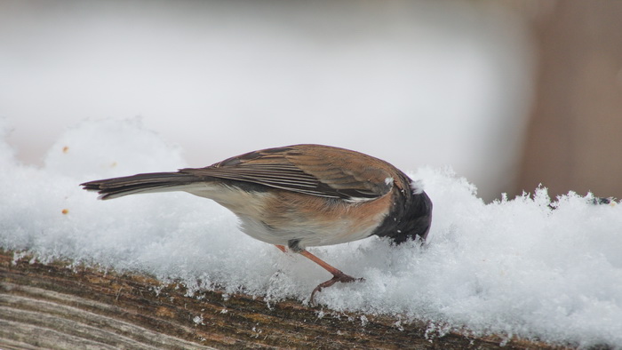 6) Don’t forget the critters! Feed the squirrels and the pigeons in the parks. Put out seed and water for the little birds that are wintering in your neighborhood. Hang a suet feeder or just put some peanut butter on a branch. Then get ready with your camera. If you make no sudden movements, you may get some to eat out of your hand! All the bird pictures were taken this morning on my front porch. They are Dark-eyed Juncos, Oregon variation.