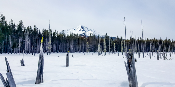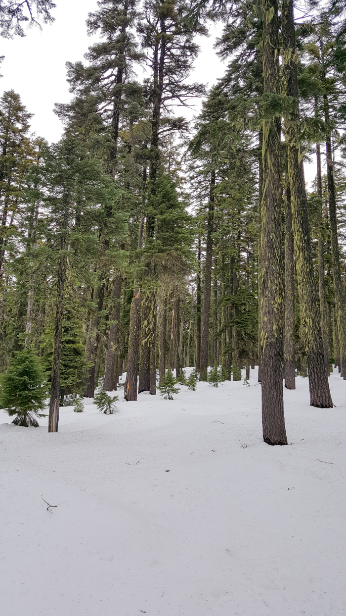 The first few hours made me doubt this whole project. It was so icy going around Mount McLoughlin that I was falling down every few minutes. The side slope was not that steep, but just enough to be treacherous with the ice. I finally got wise and headed down to Four Mile Lake, around, then back up. I hate giving up elevation but sometimes it must be done.