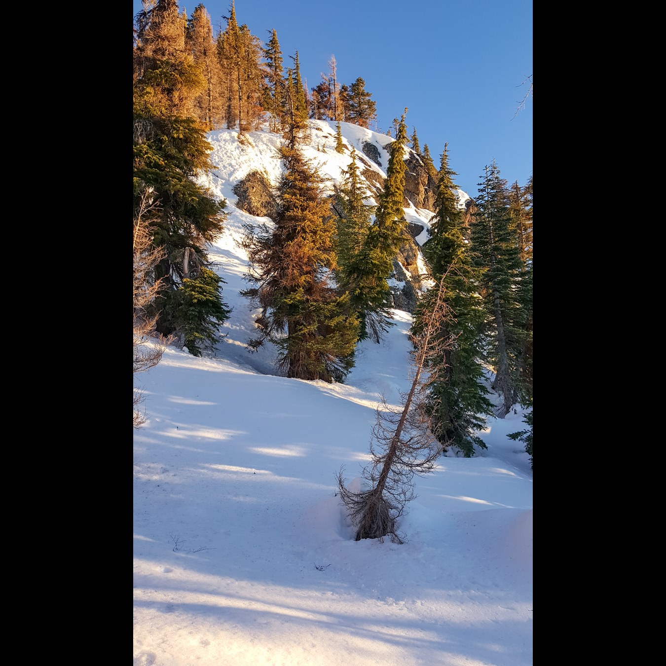 Going through the burn on the west slopes of Ruth, Ethel, and Maude was a challenge. The bare slopes were drenched in sun and the surfaces were beginning to wet. Lots of stomping and side stepping. I also learned to walk downhill backwards so my skins could have their full effect. Does anyone else do that?