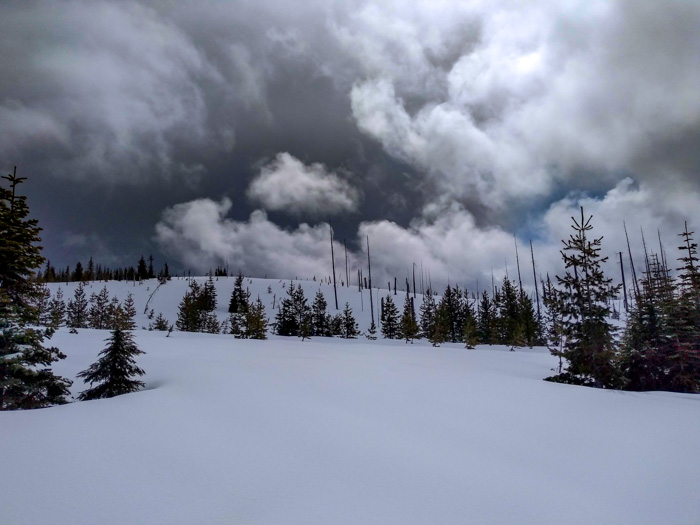 I was going to get up at 5 and leave by 6, but I slept in until 6! I left at 7 and I’m glad I did. Leaving earlier would have just meant an extra hour fighting the ungroomed crusty snowmobile tracks. About the time I climbed up to the high point and left the shady west side, the sun was just starting to soften the surface and my speed picked up. It was really fun descending the 1000 foot drop at 10 mph or more! That’s fast for a backcountry skier!