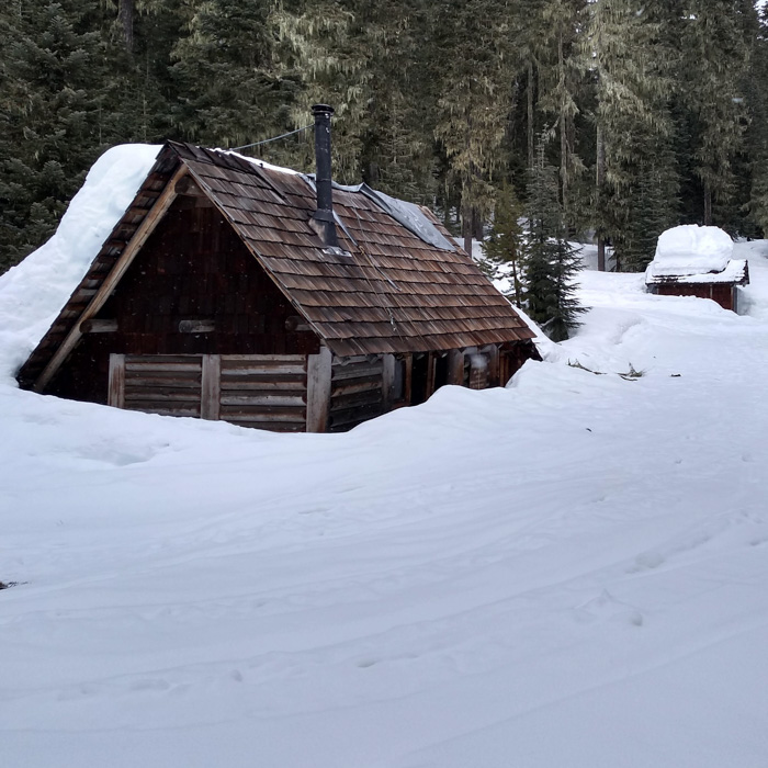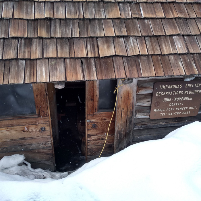 The cabin at Lake Timpanogas was really a warming hut, but 3 people could sleep there. There was no wood, but I didn’t think it mattered. The doors didn’t close because someone left them frozen open. They were sliding barn doors about two feet apart. But there was an outhouse 100 feet away! No need to set up the tent or dig cat holes!