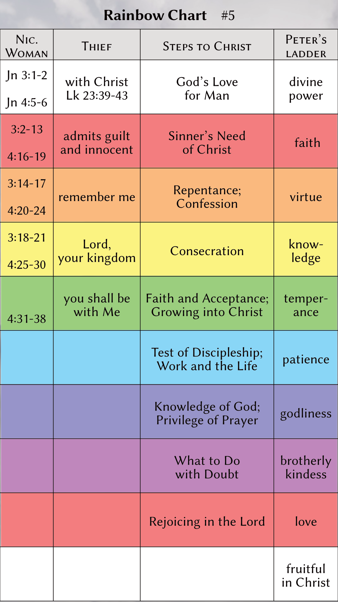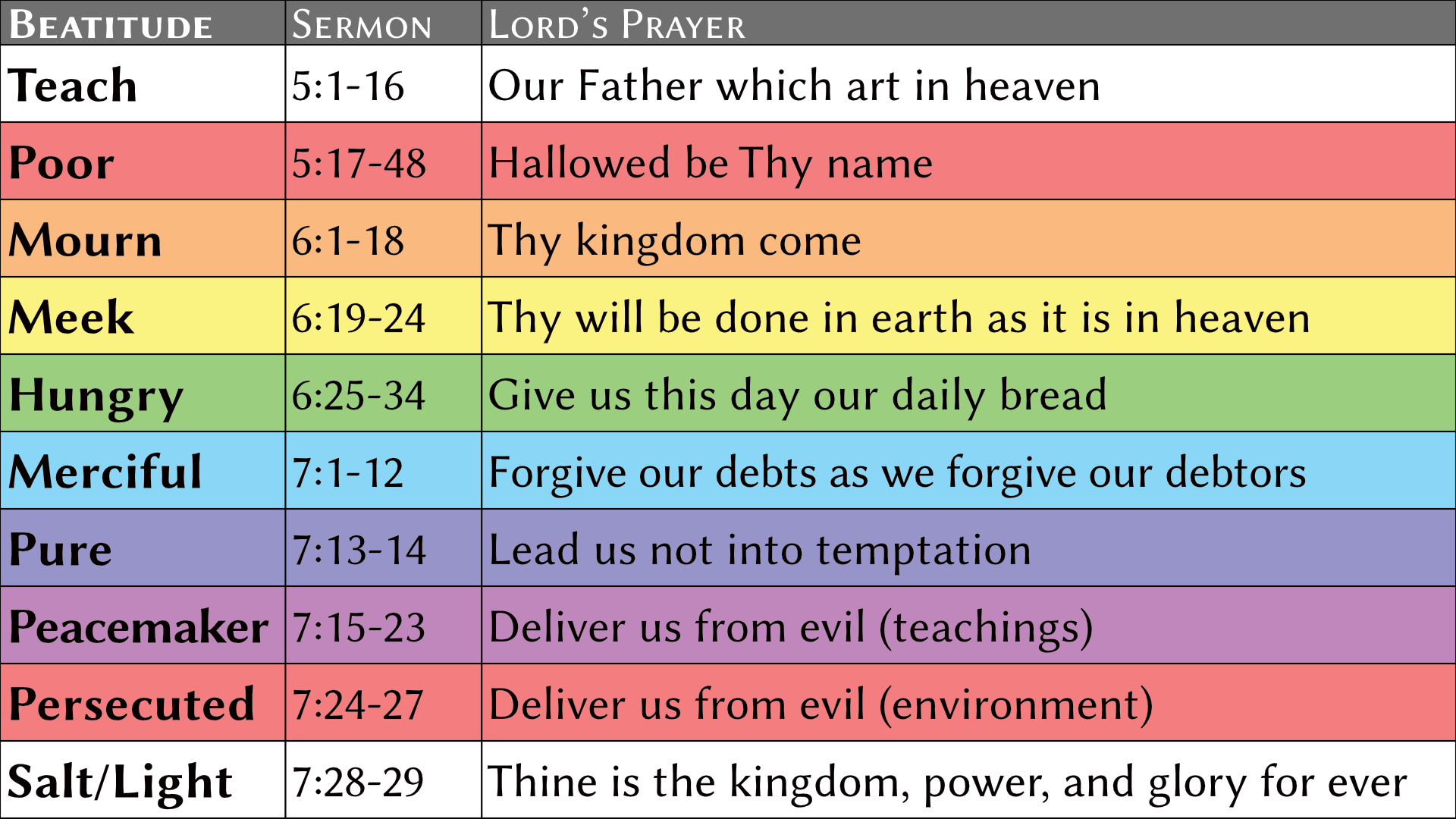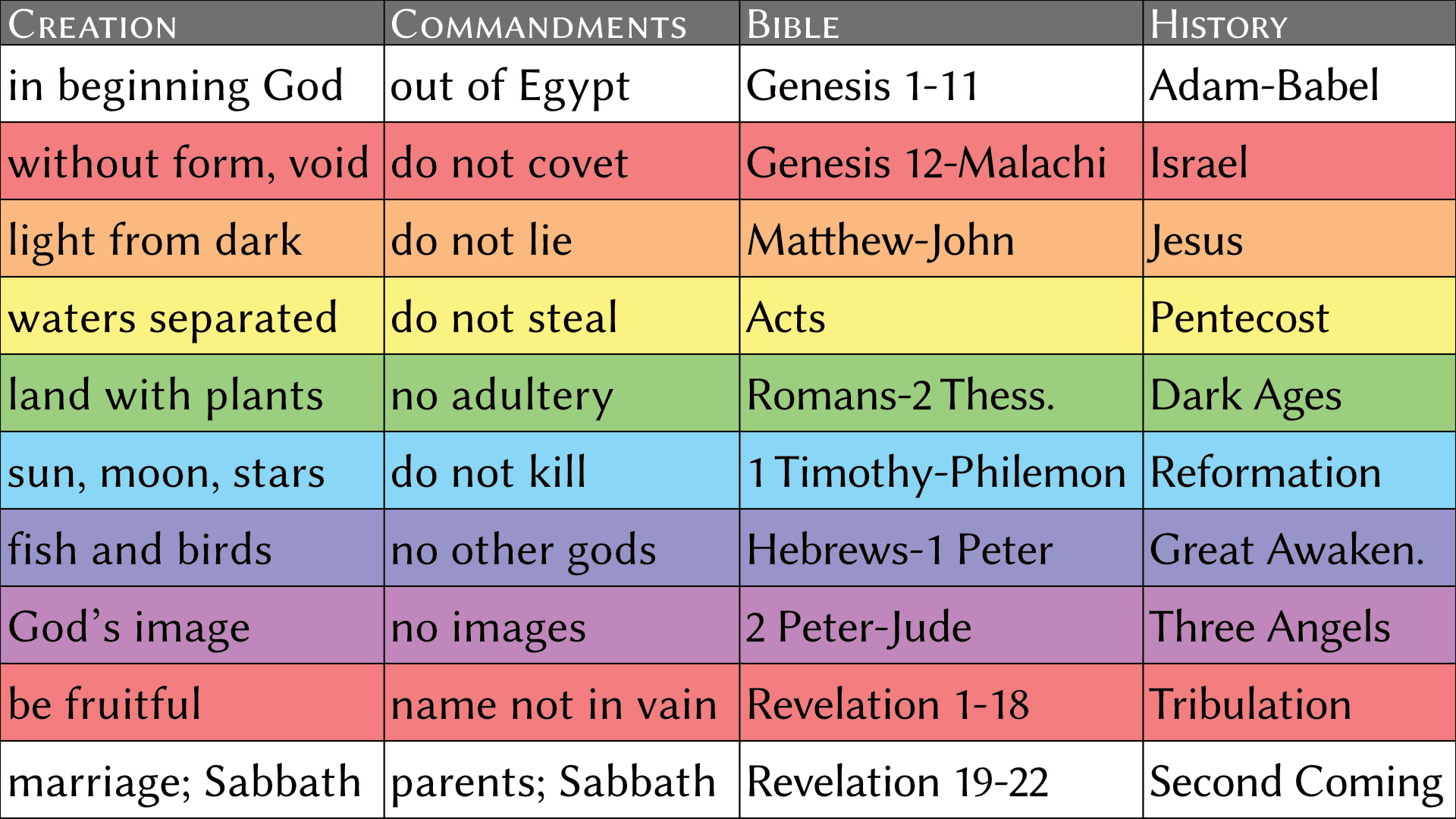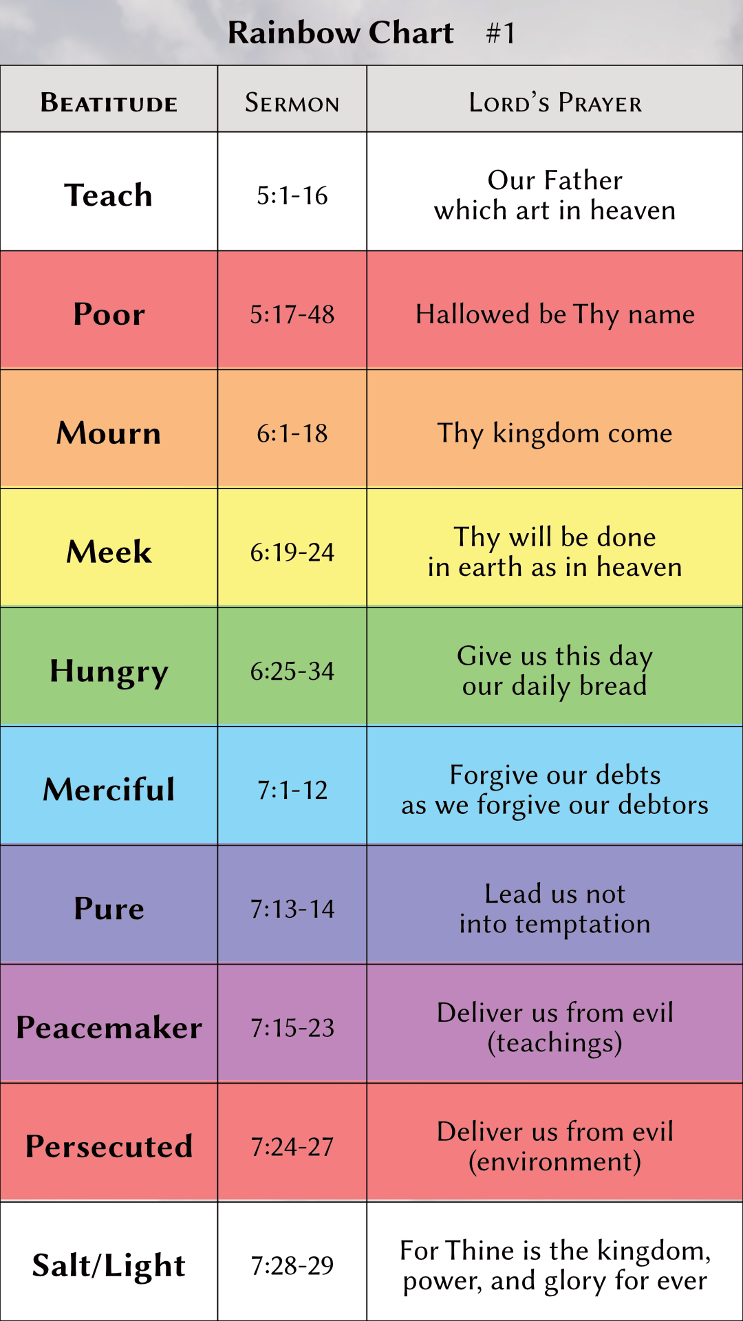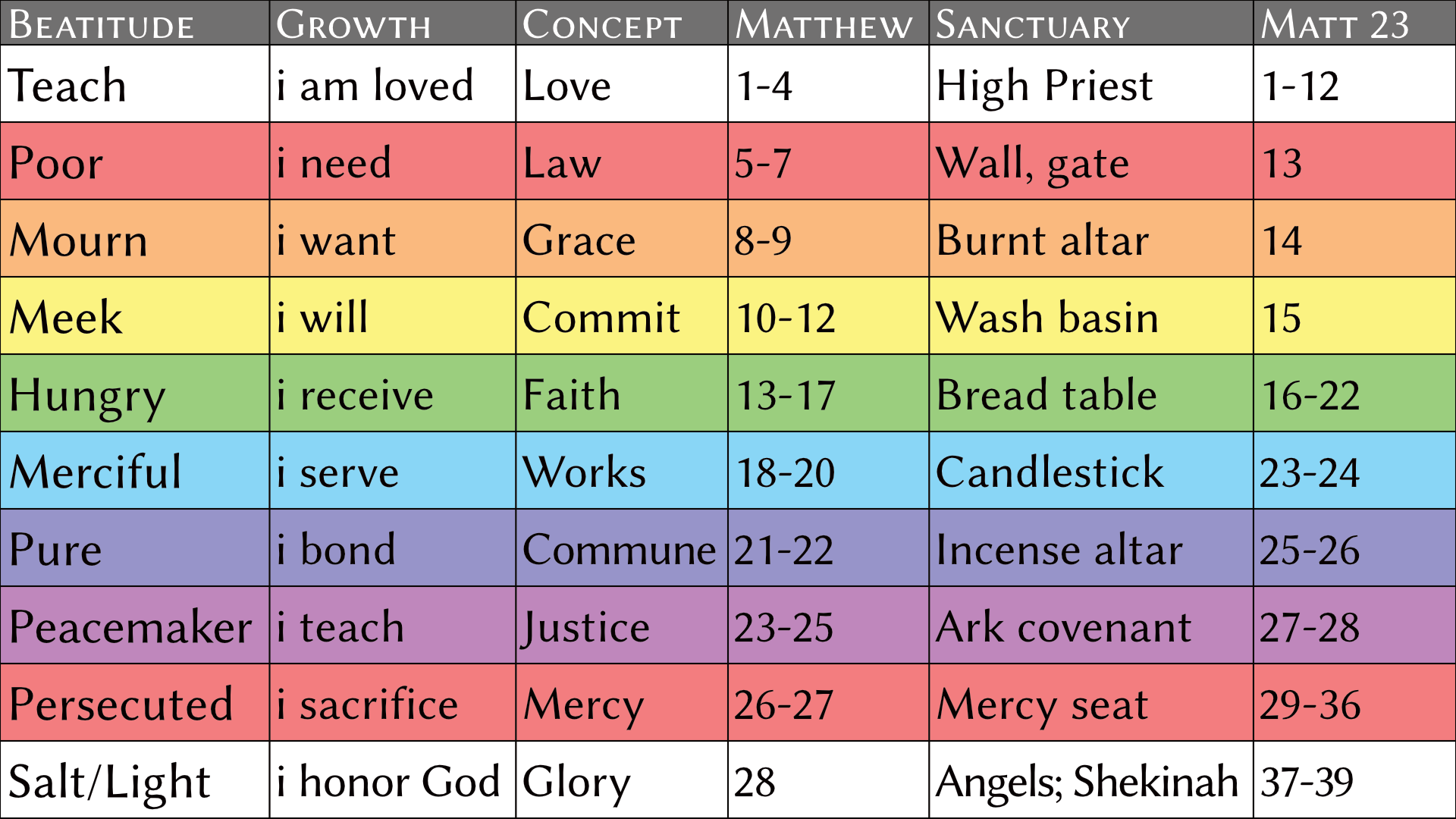 On the surface, the Book appears to be a random collection of stories, but patiently viewing it through the lens of faith, hope, and love reveals an intelligent organization. Its major movements and events are all based on the sequential truths of the Beatitudes. These are the blessings at the beginning of the Sermon on the Mount. These spiritual principles are taught over and over again in the same order. We see them easily in the creation story, the sanctuary, the ten commandments, and elsewhere. In fact, all of history and the whole Bible itself are outlined with the rainbow colors of the blessings. The Beatitudes are your beautiful steps to Christ and eternal happiness. Click on a column in any rainbow chart to learn more about it.