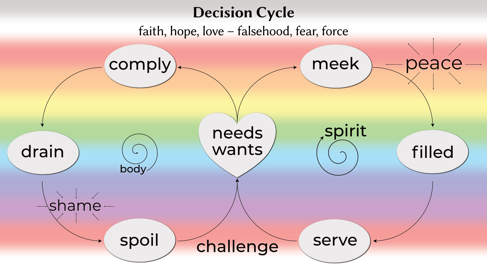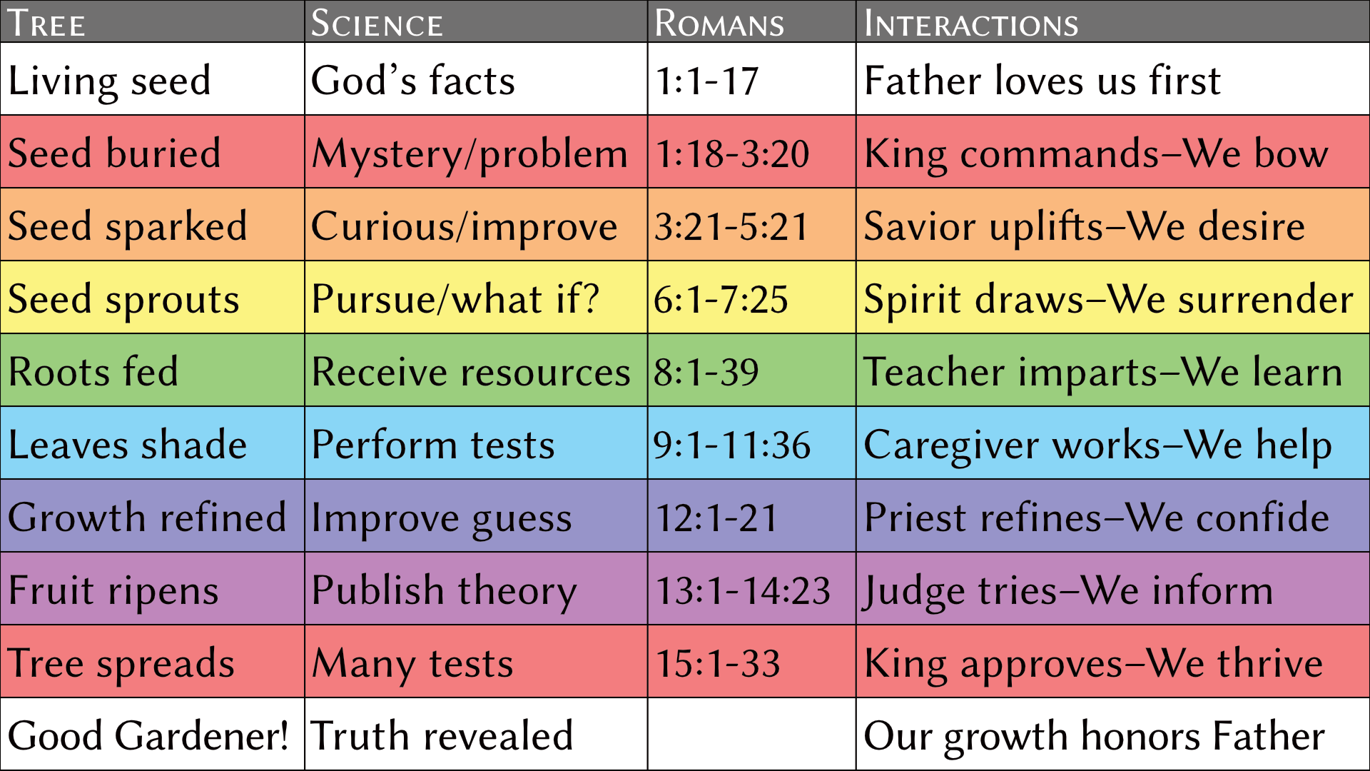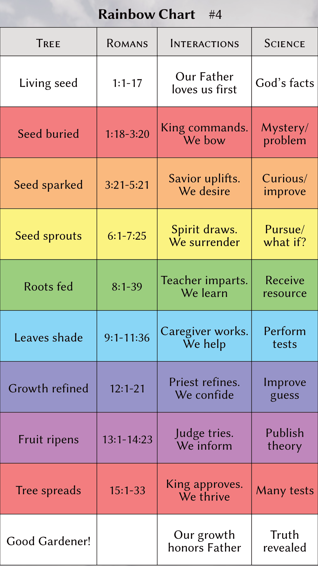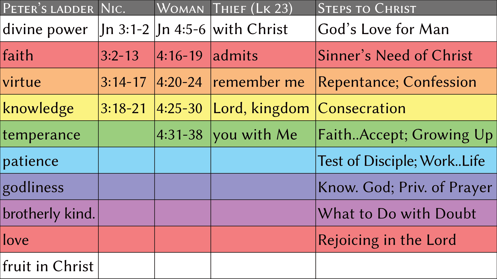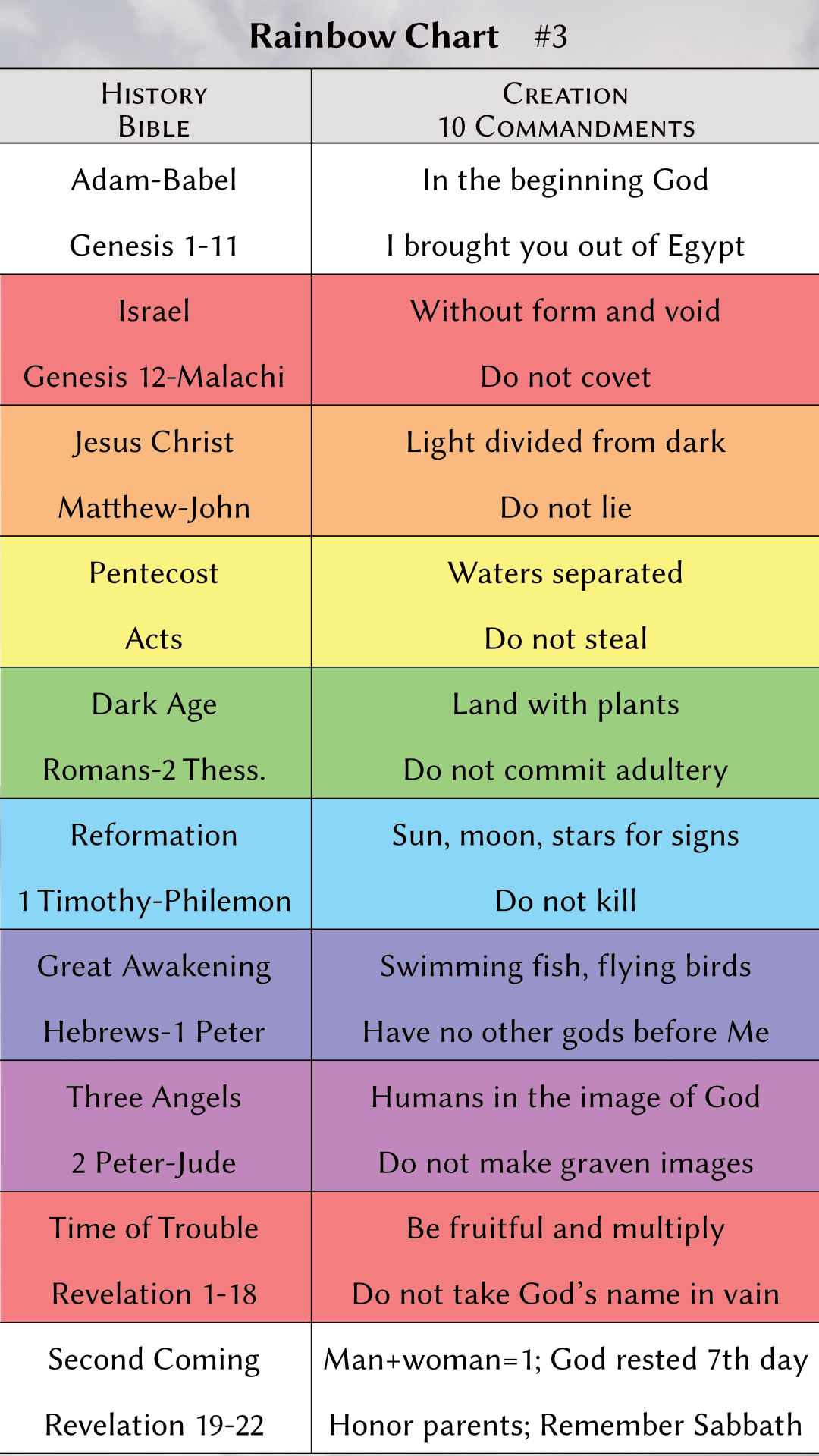 On the surface, the Book appears to be a random collection of stories, but patiently viewing it through the lens of faith, hope, and love reveals an intelligent organization. Its major movements and events are all based on the sequential truths of the Beatitudes. These are the blessings at the beginning of the Sermon on the Mount. These spiritual principles are taught over and over again in the same order. We see them easily in the creation story, the sanctuary, the ten commandments, and elsewhere. In fact, all of history and the whole Bible itself are outlined with the rainbow colors of the blessings. The Beatitudes are your beautiful steps to Christ and eternal happiness. Click on a column in any rainbow chart to learn more about it.